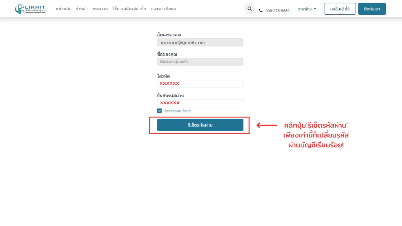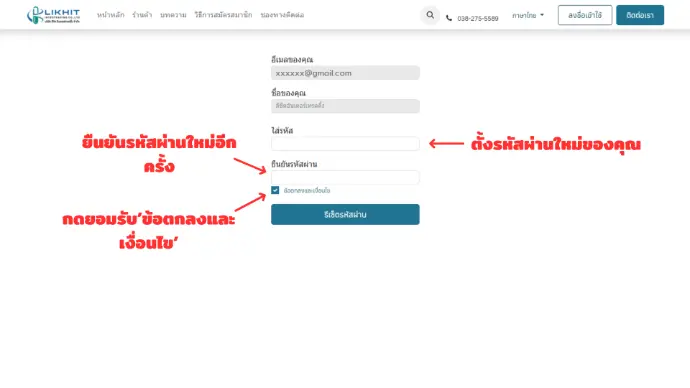 ขั้นตอนที่ 4 ทำการตั้งรหัสผ่านใหม่ของคุณในช่อง"ใส่รหัส" ยื่นยันรหัสผ่านใหม่ของคุณอีกครั้งในช่อง"ยืนยันรหัสผ่าน" กดยอมรับ"ข้อตกลงและเงื่อนไข" จากนั้นกดปุ่มรีเซ็ตรหัสผ่าน เพียงเท่านี้การเปลี่ยนรหัสผ่านก็เสร็จสิ้น