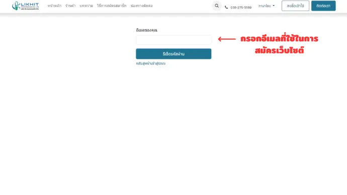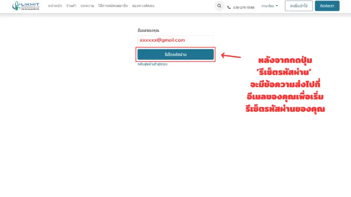 ขั้นตอนที่ 2 กรอกอีเมลที่ใช้ในการสมัครเข้าใช้งานเว็บไซต์ จากนั้นกดปุ่ม"รีเซ็จรหัสผ่าน" จะมีข้อความส่งไปที่อีเมลของคุณเพื่อเริ่มรีเซ็ตรหัสผ่าน