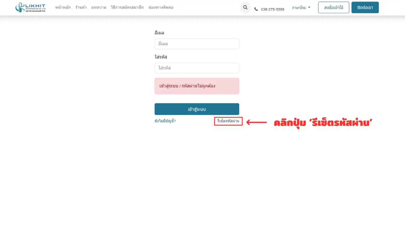 ขั้นตอนที่ 1 เข้าไปที่หน้า"ลงชื่อเข้าใช้" แล้วคลิกปุ่ม"รีเซ็ตรหัสผ่าน"ที่อยู่มุมขวาล่างของปุ่มเข้าสู่ระบบ